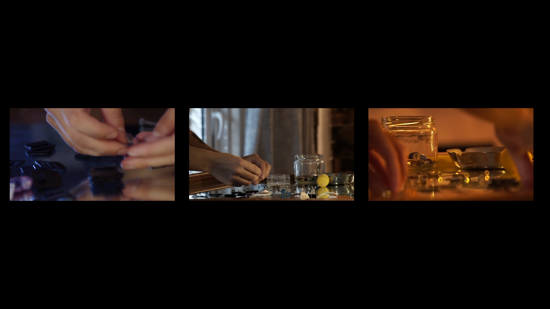 All recordings were made in the participants’ homes, following a simple invitation: to do something with their objects. These actions were not staged, but unfolded as they might in an ordinary—perhaps slightly strange—everyday moment. Each encounter was recorded with three cameras in parallel. In Anna’s and Kostas’s videos, time remains almost synchronous; in the others, time is organised through editing. The triptychs last between five and ten minutes, while the “moments” consist of short excerpts of minor movements